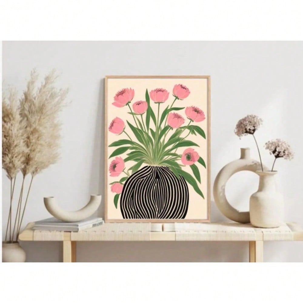 Boho Botanical Pink Peonies Canvas Wall Art Print – Unframed Minimalist Abstract Floral Vintage Poster for Office Living Room Bedroom Dorm Decor
